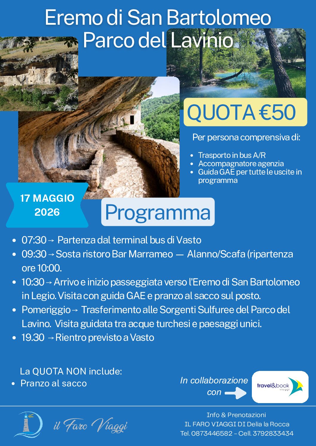 Una giornata fuori dal comune alla scoperta di due luoghi straordinari e poco conosciuti: l’eremo celestiniano più suggestivo dell’Appennino centrale, interamente incastonato nella roccia a picco sul torrente Capo La Vena, e le magiche sorgenti sulfuree del Parco del Lavino, con le loro acque dalle sfumature di turchese, verde e azzurro.